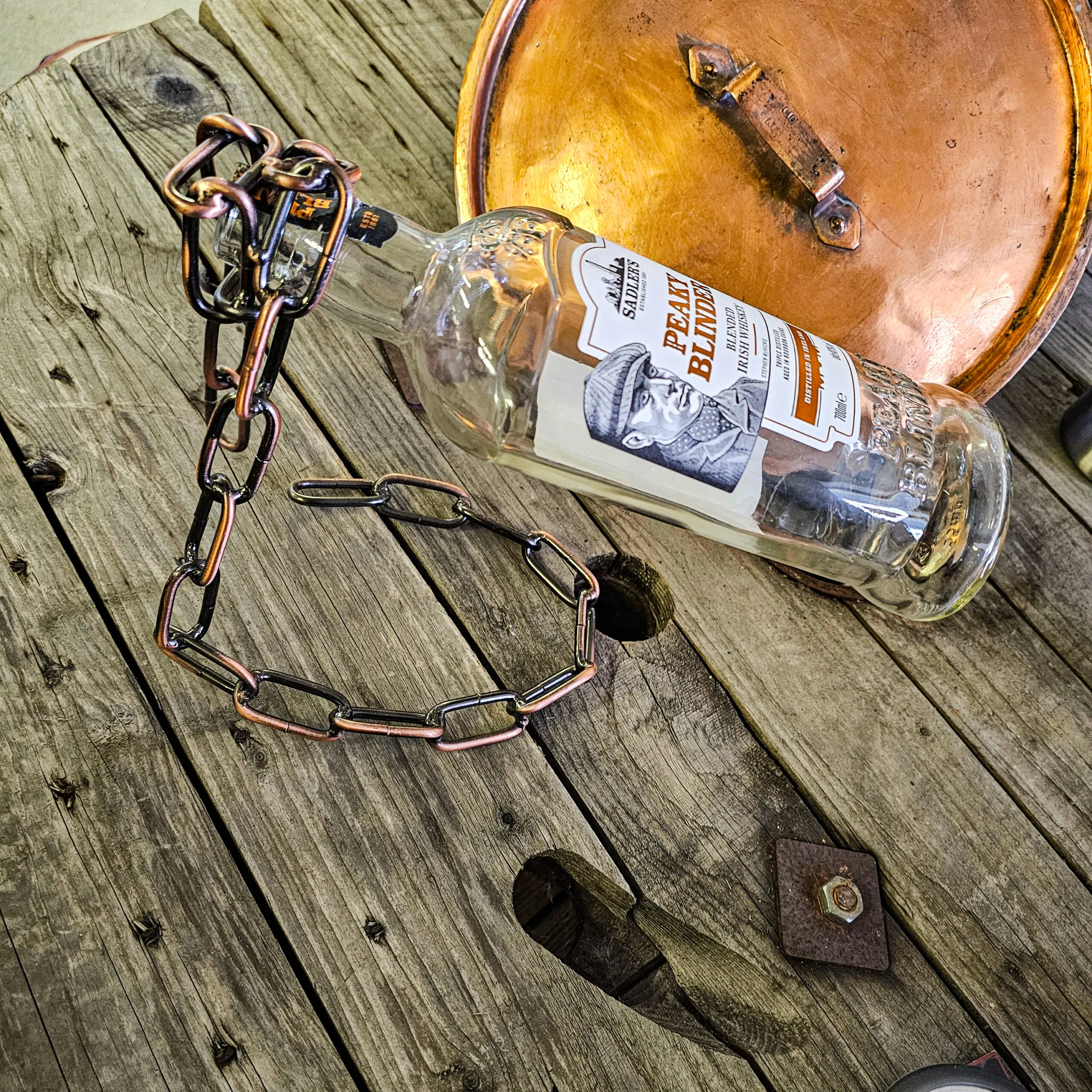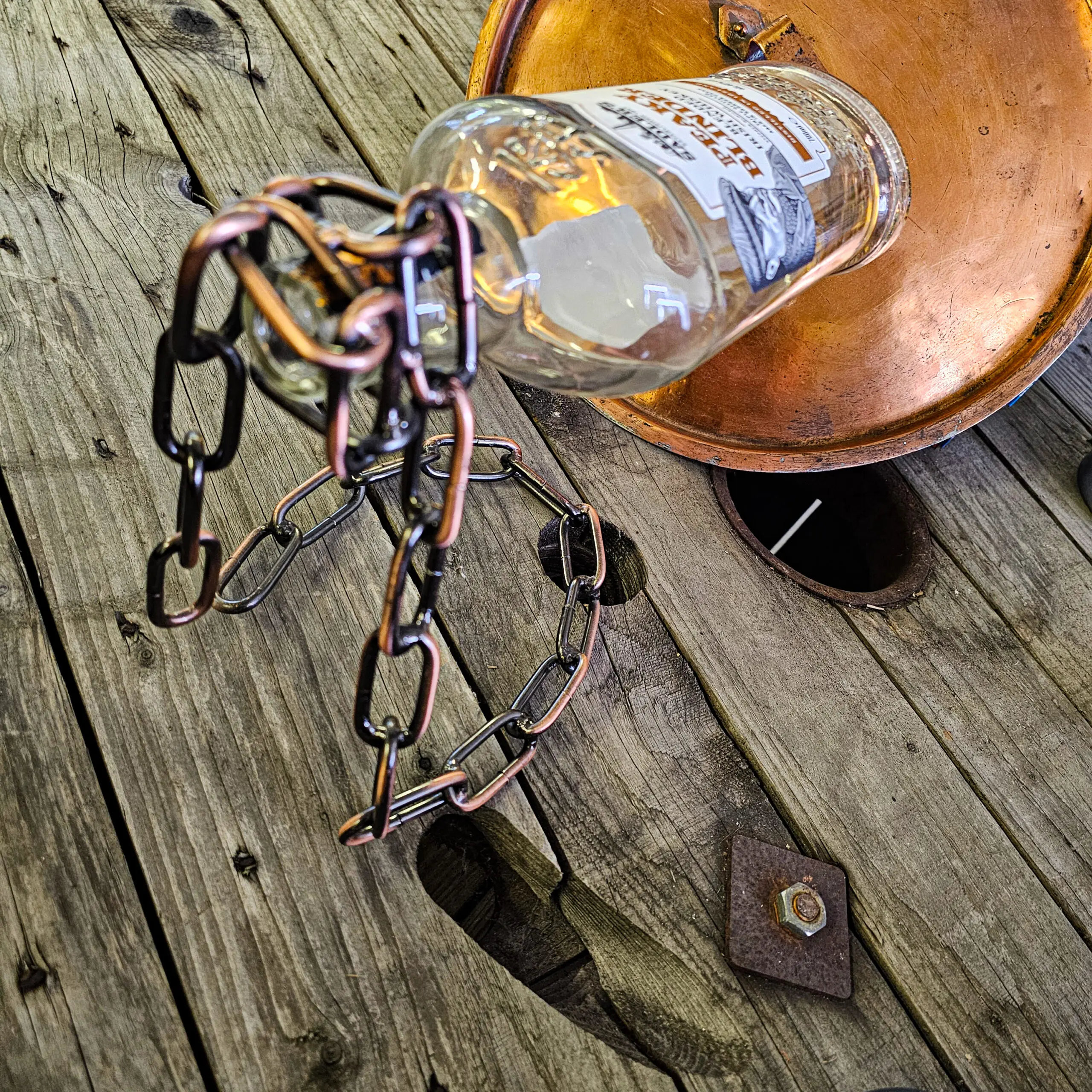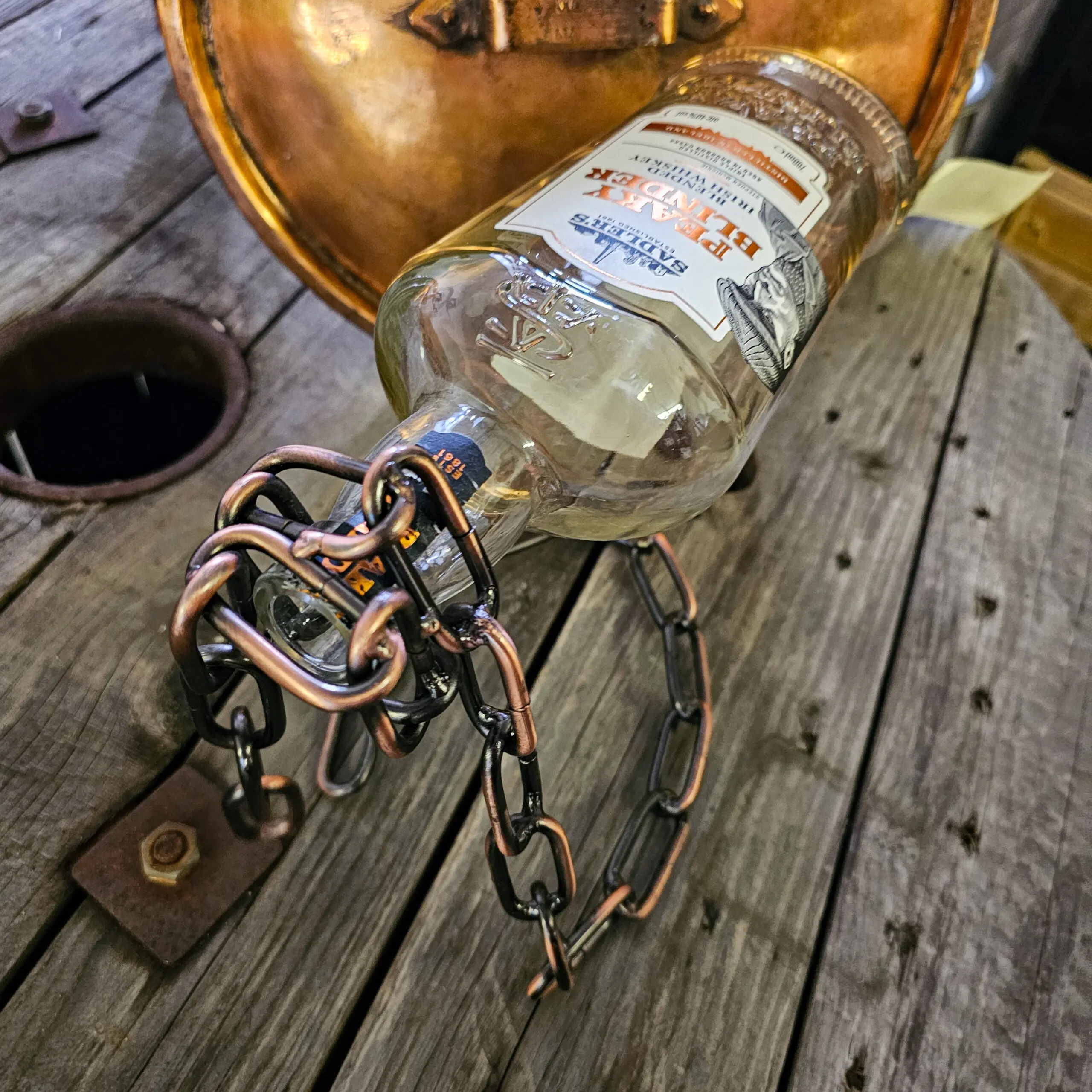 Svetsad bronsfärgad kedja som håller flaskan i luften