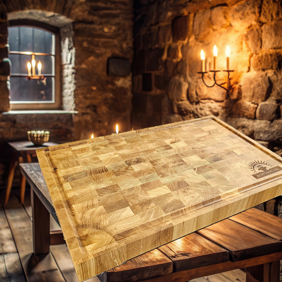 Här har du den ultimata presenten och julklappen för matlagningsentusiasten, foodies & grillers! Ett hantverk där brädan av europeisk ekträ har satts samman av ändträ som är placerat för maximal hållbarhet och hårdhet. Skärbräden har handslipats och oljats innan den placerats i en skyddande krympfilm. Varje bräda är unik, där mörkare och ljusare ekträ kombineras.