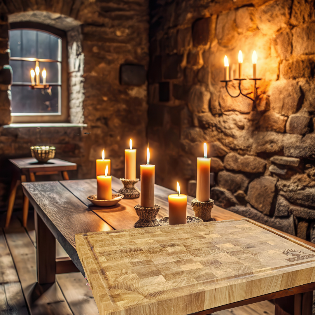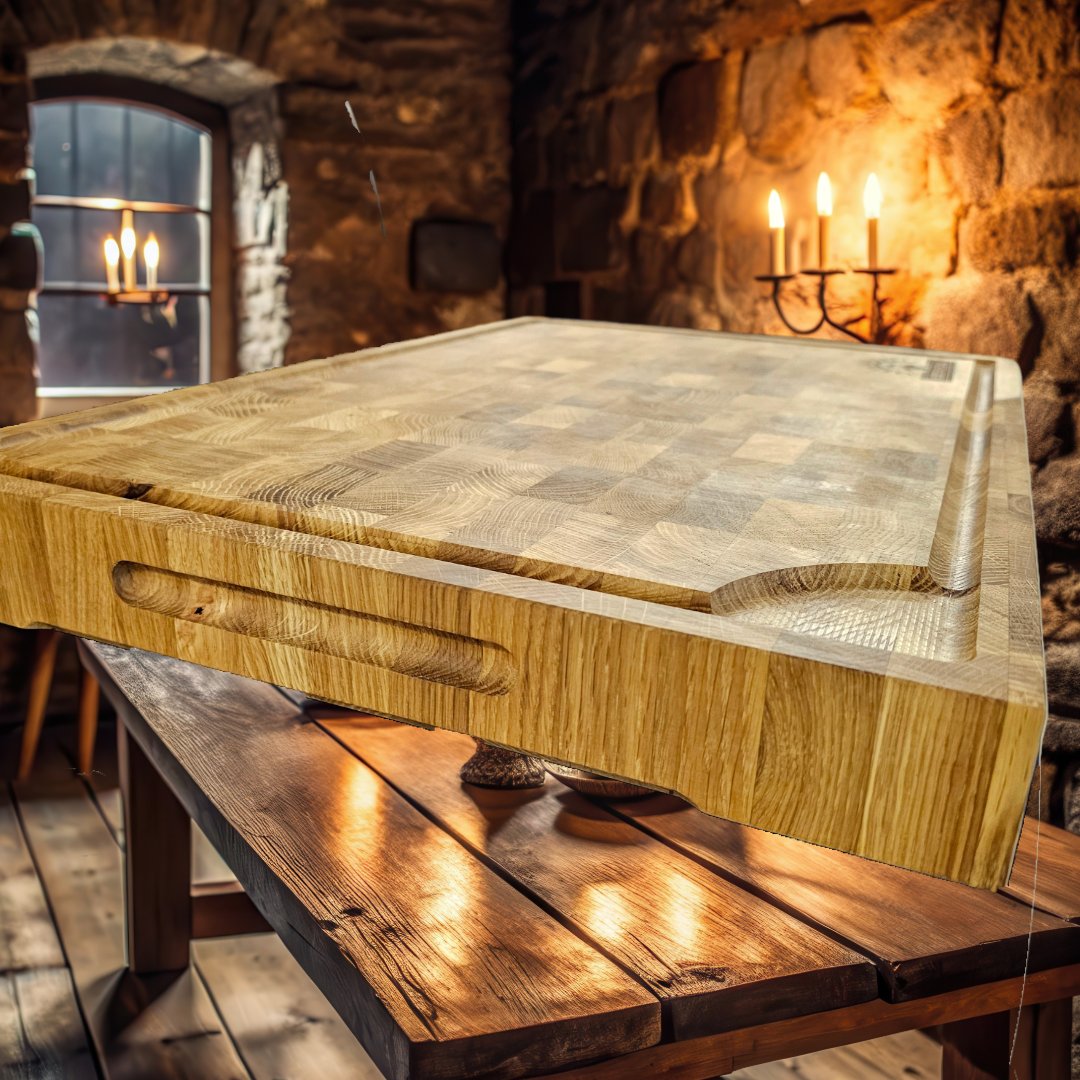 Skärbräda av XL storlek: 80cm bred, 40cm djup och en tjocklek på 5cm! Vågen har sagt sitt: ekbrädan väger in på en matchvikt på imponerande 8,5kg.