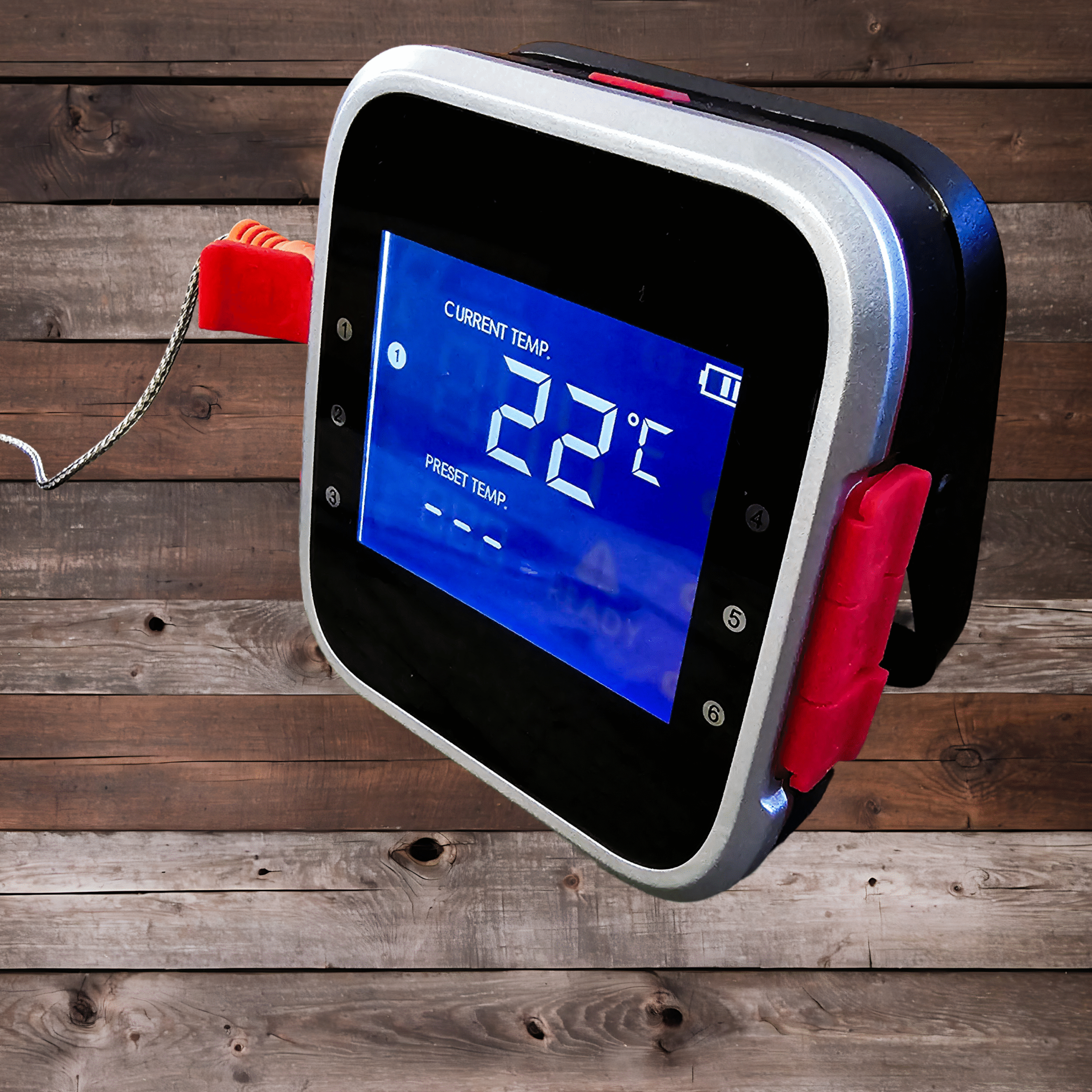 Denna BBQ och grill termometer har inbyggt, vinklingsbart stödben (som en vagga) vilket gör att du kan ha den stående, liggande eller hängandes med en vinkel som gör displayen visuellt tydlig oavsett position.